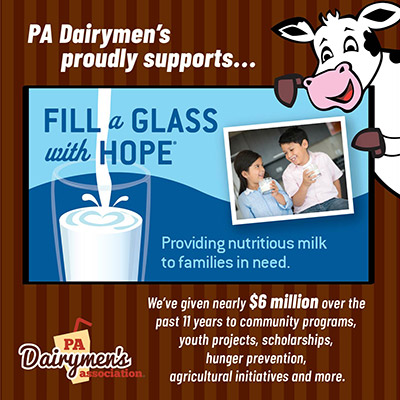 The Pennsylvania Dairymen’s Association has been supporting “Fill a Glass with Hope®” with agriculture partners, Feeding PA, American Dairy Association North East, corporate partners and food banks since 2015. In fact, we helped launch the first statewide charitable fresh milk distribution program in the U.S. with Feeding Pennsylvania and American Dairy Association North East. Fill a Glass with Hope® has provided more than 41 million servings of milk to families in need.